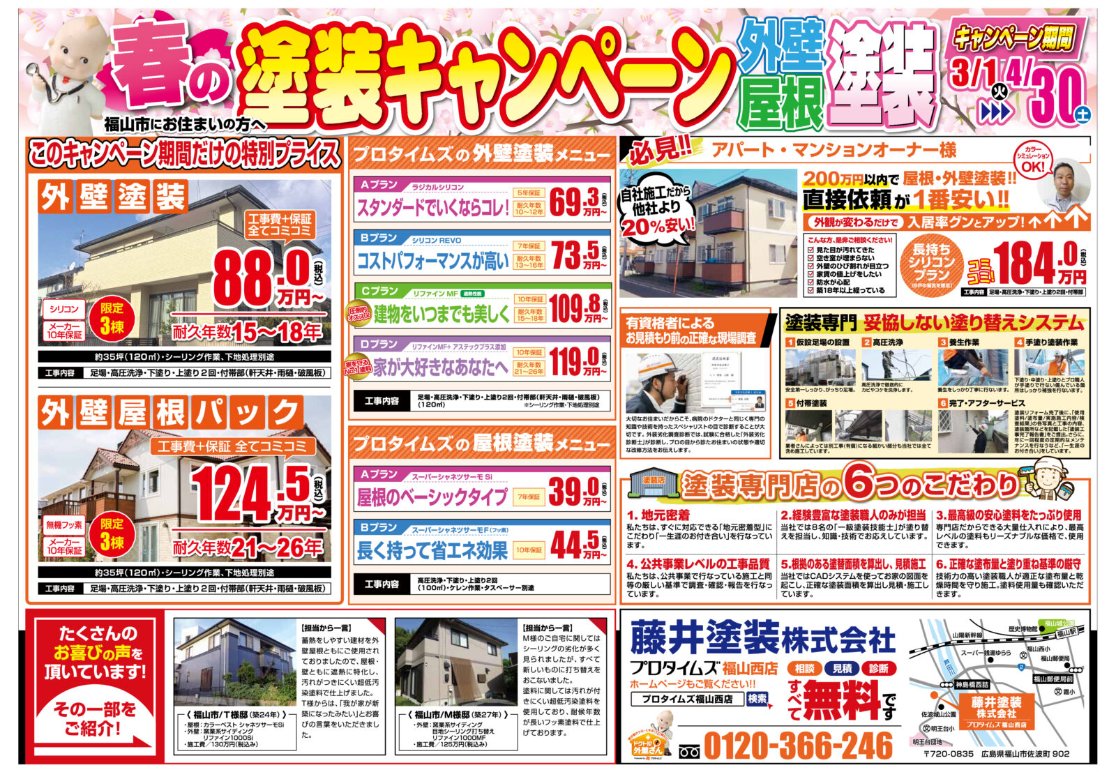 キャンペーンのお知らせです! 2022年03月23日(水) 福山市の皆様 こんにちは! プロタイムズ福山西店 藤井塗装です! 今回はただいま開催中の 「春の塗装キャンペーン」のお知らせです! クリックで拡大します↓ お家の塗り替えをお考えの方、お得なキャンペーンを ご活用くださいませ! もちろんお見積りだけでも大歓迎です! お気軽にどうぞ! 福山市の外壁塗装・屋根塗装専門店 プロタイムズ福山西店 藤井塗装