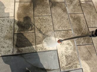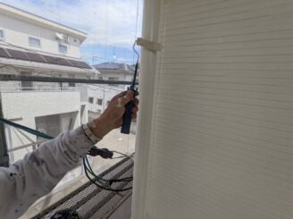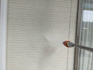 高圧洗浄で外壁に付着している、ホコリ汚れや老化塗膜などを落としていきます。