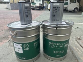 外壁色変え部中・上塗り材 超低汚染リファインMF-IR(バーチグレー)艶有・硬化剤を使います。