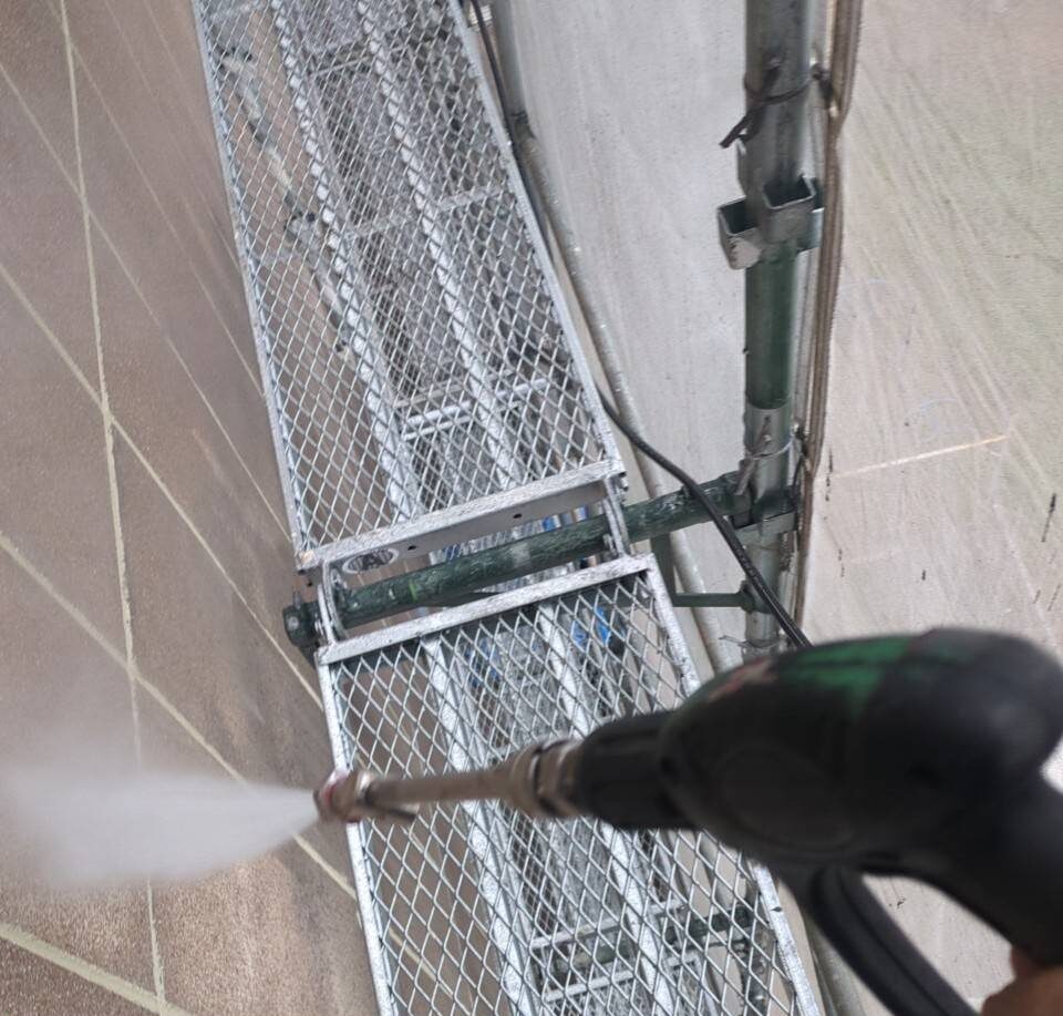 高圧洗浄で外壁に付着している、ホコリ汚れや老化塗膜などを落としていきます。