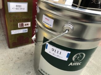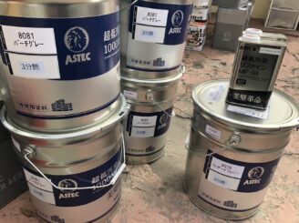 外壁中・上塗り材超低汚染リファイン1000MF-IR(バーチグレー・ウィザードコッパー)硬化剤・防カビ防藻剤を使います。
