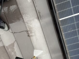 高圧洗浄で外壁に付着している、ホコリ汚れや老化塗膜などを落としていきます。