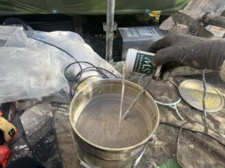 外壁中・上塗り材に防藻剤を入れよく混ぜて使います。