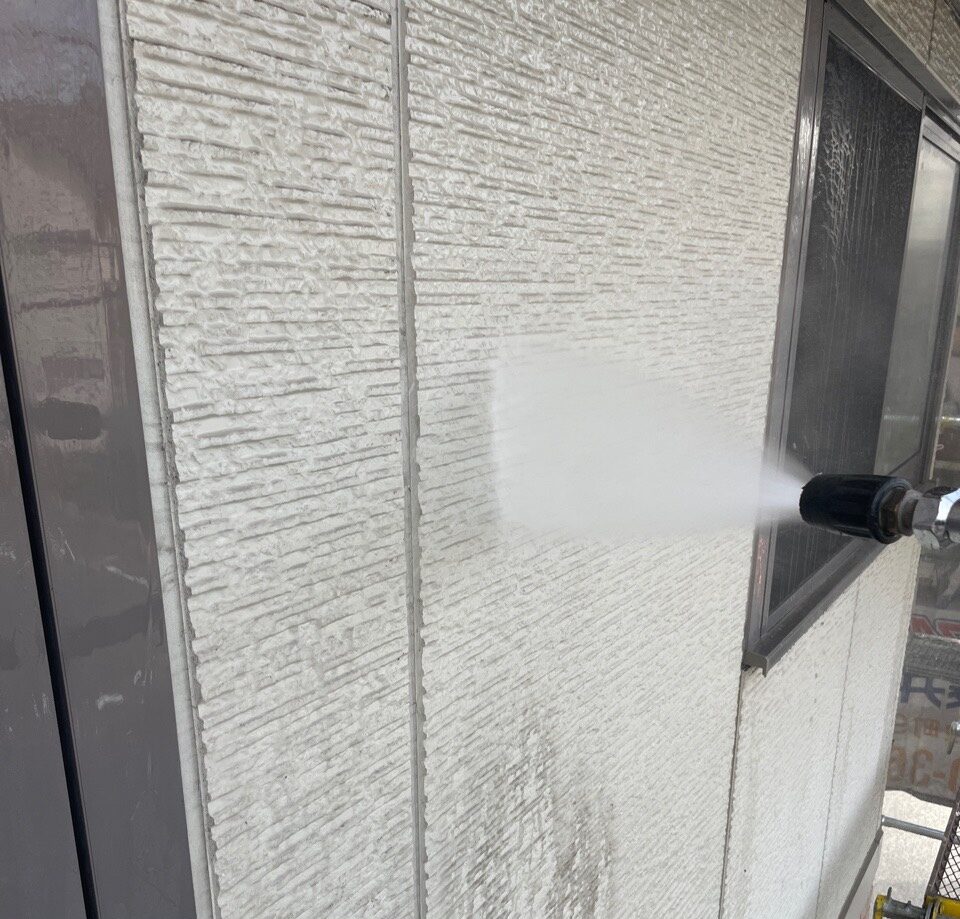 高圧洗浄で外壁に付着している、ホコリ汚れや老化塗膜などを落としていきます。