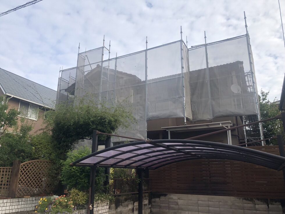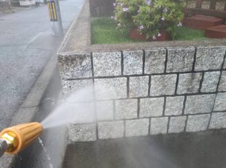 高圧洗浄で外壁に付着している、ホコリ汚れや老化塗膜などを落としていきます。