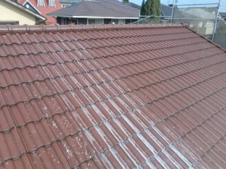 屋根中・上塗り材はスーパーシャネツサーモSI(マホガニー)を使います。