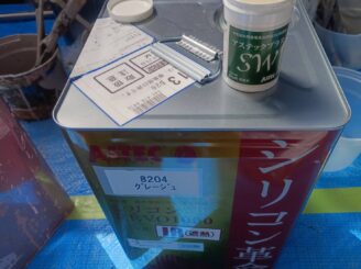 外壁中・上塗り材に防藻剤を入れよく混ぜて使います。