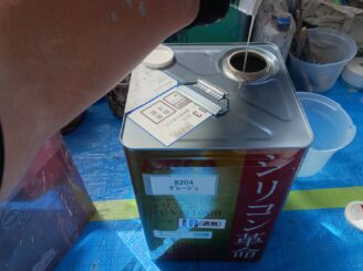 外壁中・上塗り材はシリコンREVO1000IR(グレージュ)・防カビ剤を使います。