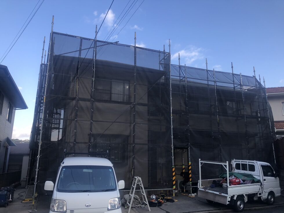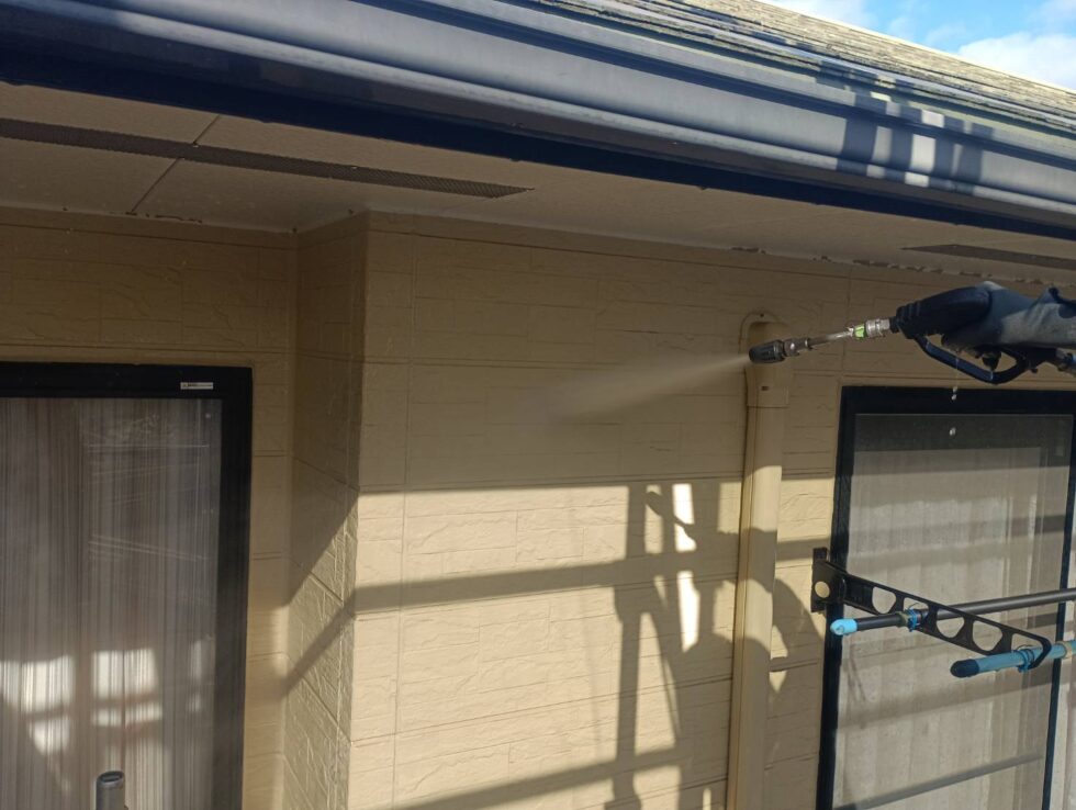 高圧洗浄で外壁に付着している、ホコリ汚れや老化塗膜などを落としていきます。