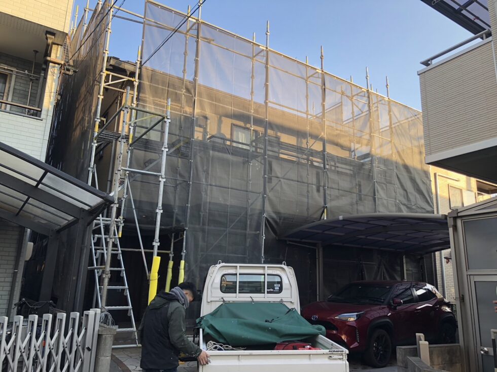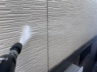 高圧洗浄で外壁に付着している、ホコリ汚れや老化塗膜などを落としていきます。